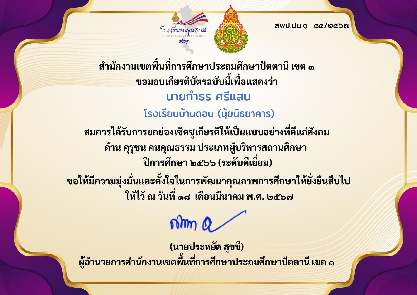 ชื่อผลงาน : รางวัลคุรุชน คนคุณธรรม ประเภทผู้บริหารสถานศึกษา ปีการศึกษา 2566 (ระดับดีเยี่ยม) ระดับเขตพื้นที่การศึกษา