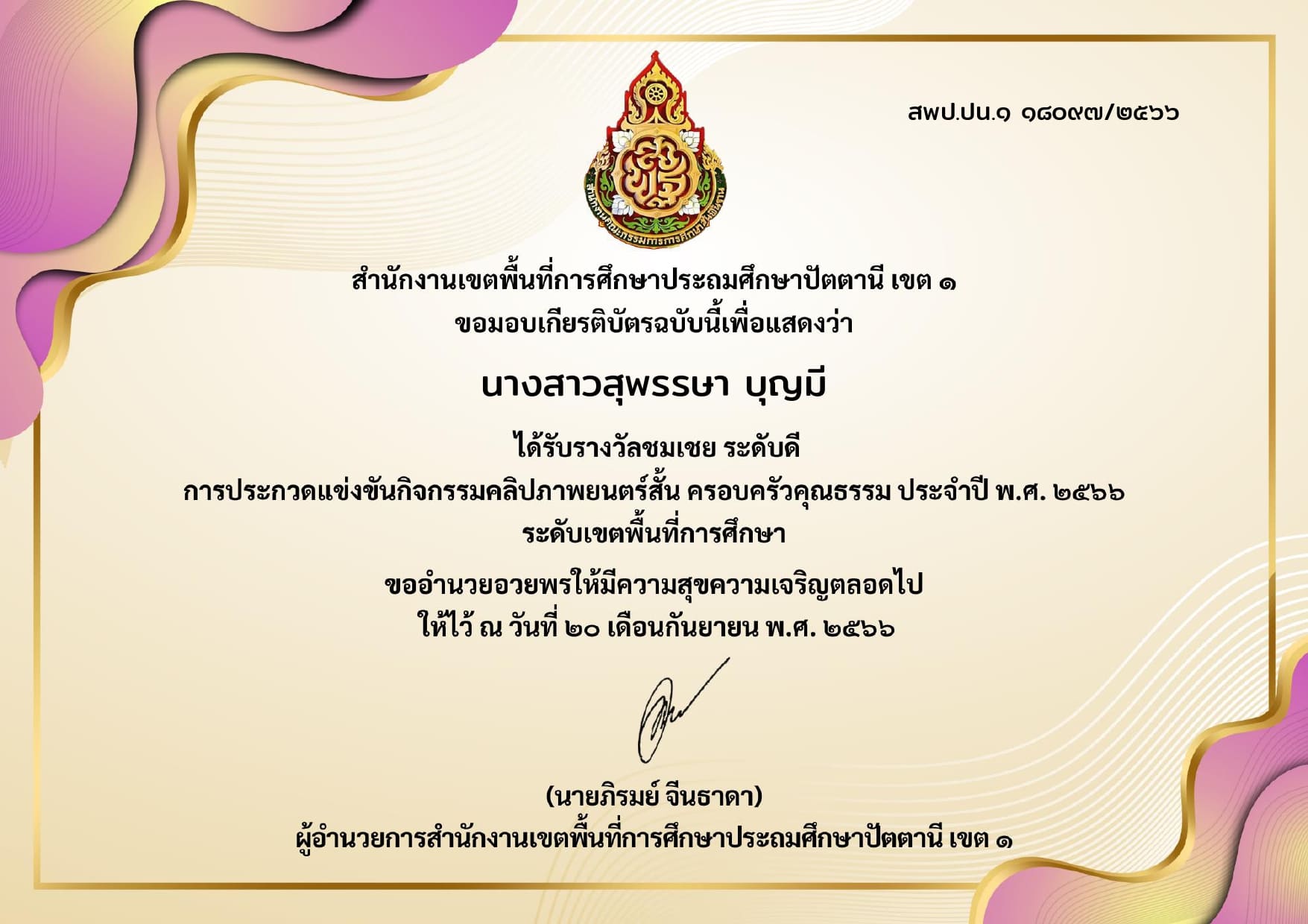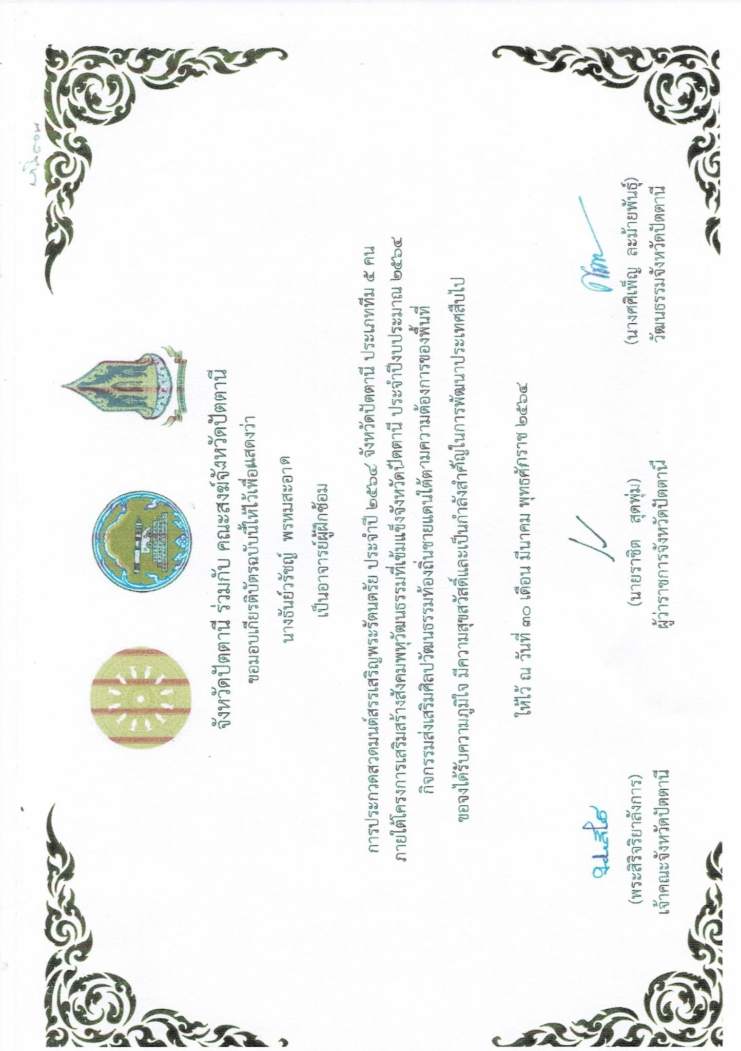 เป็นอาจารย์ผู้ฝึกซ้อมได้รางวัลชมเชยการประกวดหมู่สรรเสริญพระรัตนตรัย ทำนองสรภัญญะ ประเภท 5 คน ระดับประถมศึกษา ประเภททีมหญิงล้วน ประจำปี 2564 ระดับจังหวัดปัตตานี |