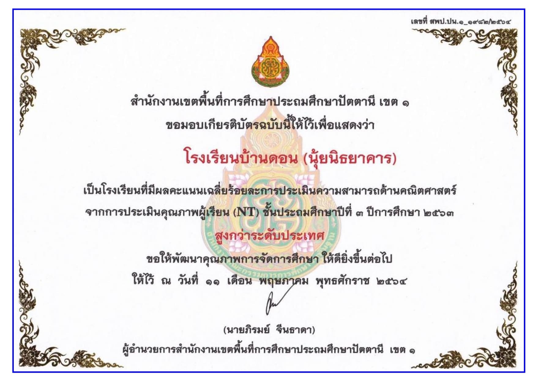 ครูผู้รับผิดชอบ ได้รับรางวัลเป็นโรงเรียนที่มีผลคะแนนเฉลี่ยร้อยละการประเมินความสามารถด้าน คณิตศาสตร์ จากการประเมินคุณภาพผู้เรียน (NT) ชั้นประถมศึกษาปีที่ 3 ปีการศึกษา 2563 สูงกว่าระดับประเทศ