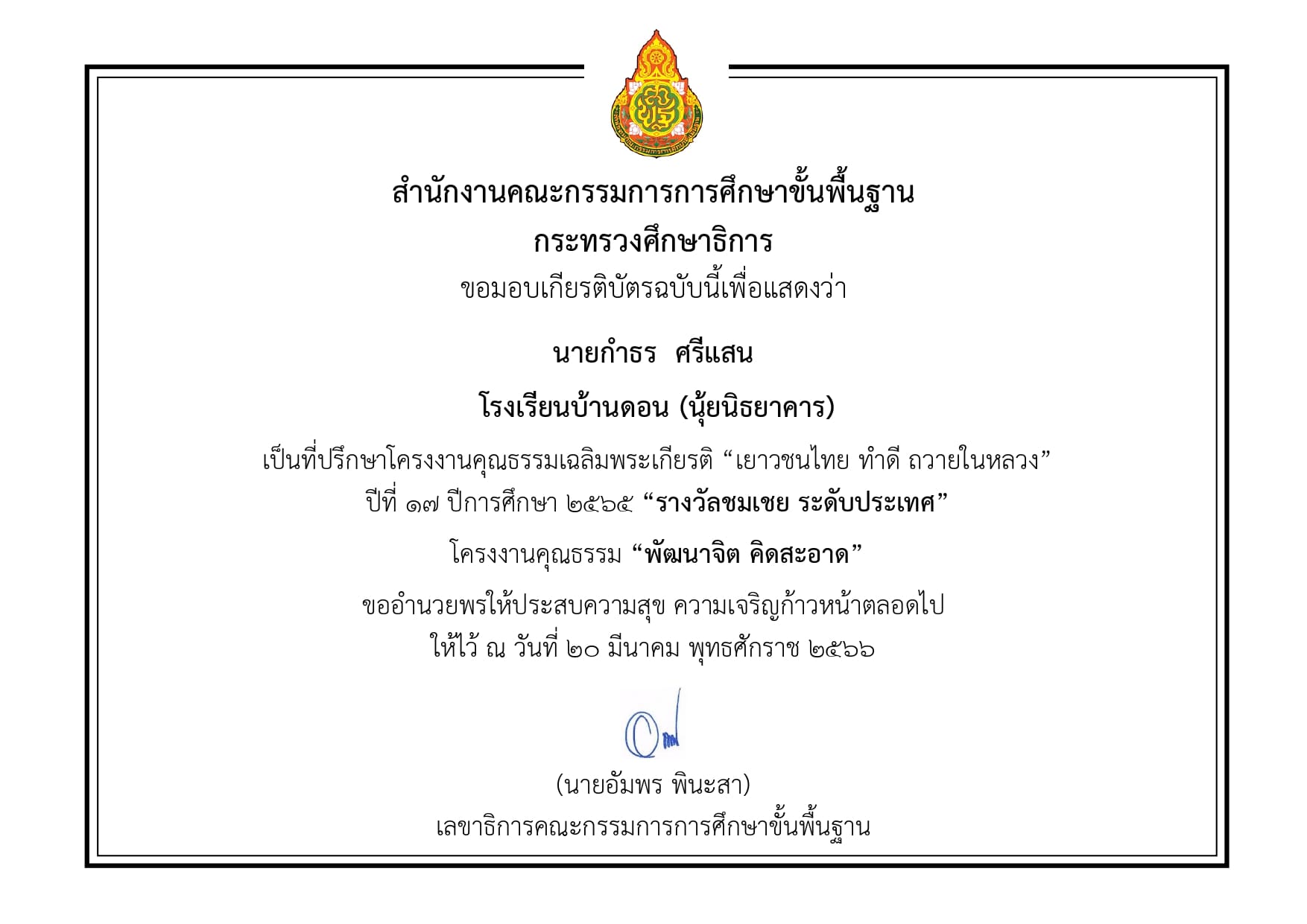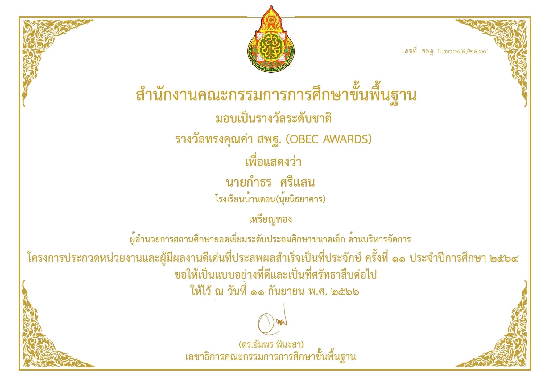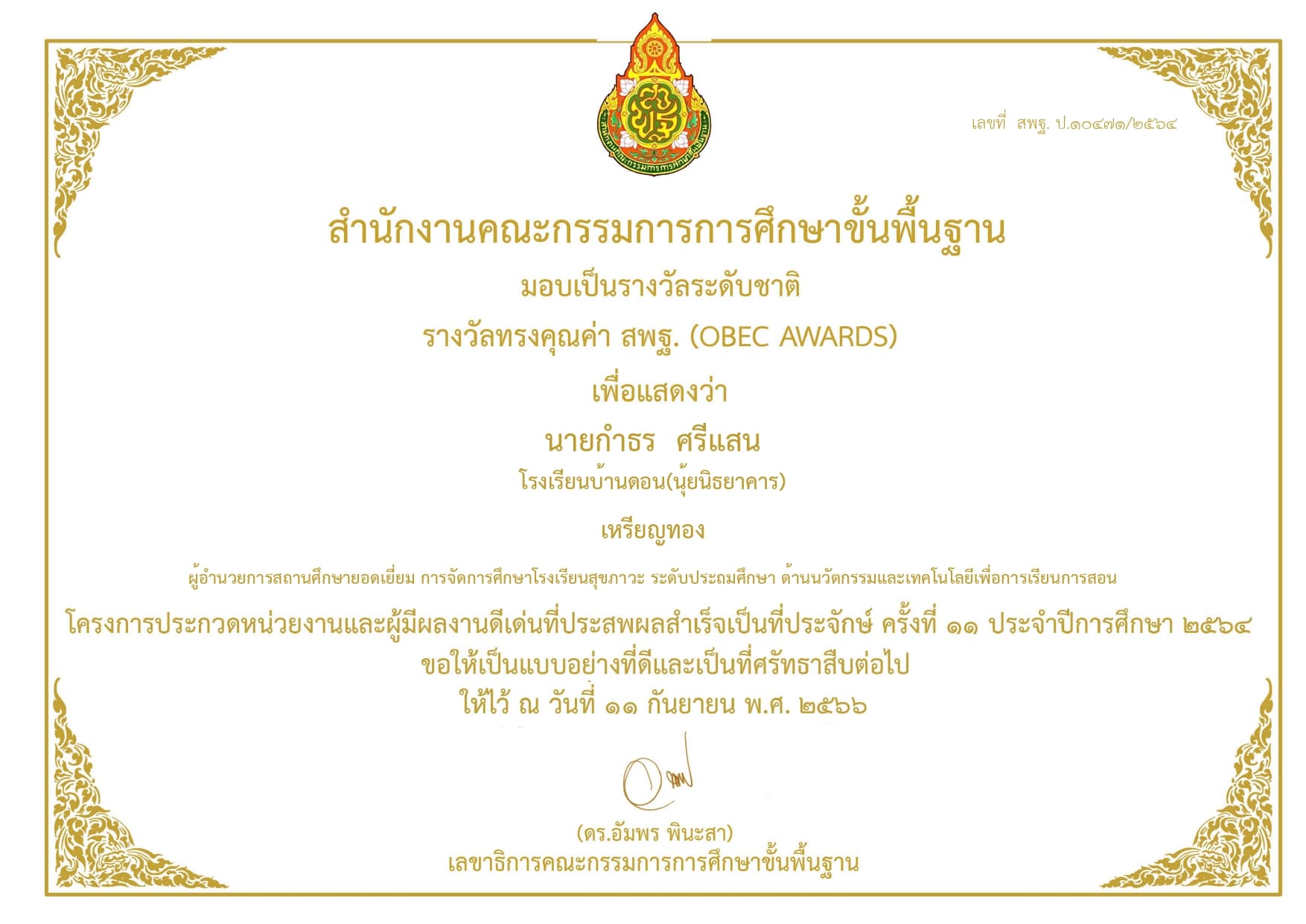 รางวัลทรงคุณค่า สพฐ. (OBEC AWARDS) ปีการศึกษา 2564 ด้านนวัตกรรมและเทคโนโลยีเพื่อการเรียนการสอน ผู้อำนวยการสถานศึกษายอดเยี่ยม การจัดการศึกษาโรงเรียนสุขภาวะ ระดับประถมศึกษา รองชนะเลิศเหรียญทอง จาก สพฐ. |
